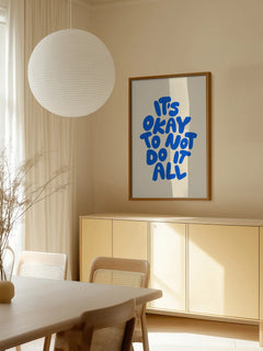 Ein inspirierendes Poster mit dem Zitat "It's okay to not do it all" in blauen Buchstaben auf einem beigen Hintergrund. Die Botschaft ermutigt zur Selbstakzeptanz und Gelassenheit im Alltag. Perfekt für eine Bilderwand, um positive Vibes in deinem Raum zu verbreiten.
