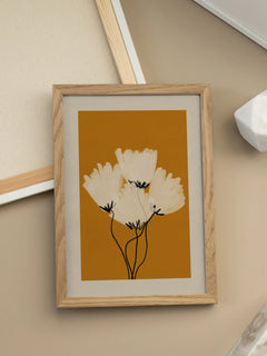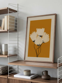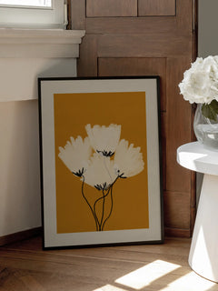 Dieses Poster zeigt eine elegante Illustration von weißen Blumen mit schwarzen Stängeln vor einem warmen orangefarbenen Hintergrund. Der beige Rand verleiht dem Bild eine zusätzliche Dimension und hebt die floralen Elemente hervor. Diese Komposition bringt Farbe und Leben in jeden Raum und ist ideal für das Wohnzimmer oder Schlafzimmer geeignet.