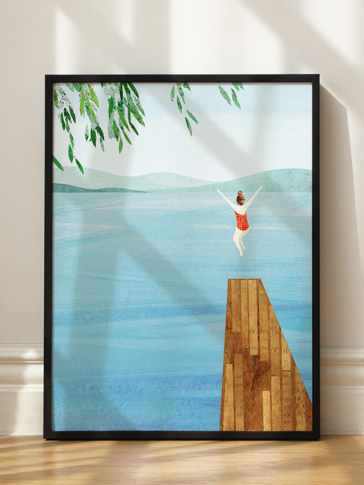 Dieses farbenfrohe Poster zeigt eine Illustration einer Frau, die von einem Holzsteg in einen See springt. Im Vordergrund sind grüne Blätter zu sehen, während im Hintergrund sanfte Hügel die Szene umrahmen. Die Komposition vermittelt ein Gefühl von Freiheit und Sommerfreude und bringt eine erfrischende und lebendige Atmosphäre in jeden Raum.