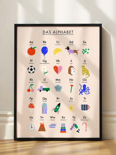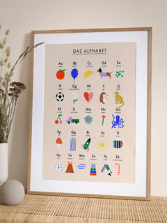 Dieses farbenfrohe Poster zeigt das deutsche Alphabet mit passenden Illustrationen zu jedem Buchstaben. Von "Apfel" bis "Zuckerstange" bietet es eine spielerische Möglichkeit für Kinder, das Alphabet zu lernen. Der helle Beigeton des Hintergrunds sorgt dafür, dass die bunten Illustrationen gut zur Geltung kommen. Ideal für Kinderzimmer oder Klassenzimmer, um das Lernen zu fördern und Spaß zu machen.