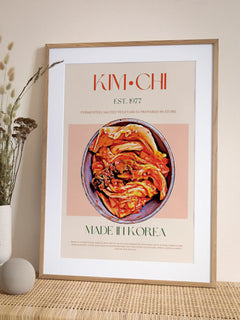 Dieses Poster feiert das traditionelle koreanische Gericht Kimchi mit einem Vintage-inspirierten Design. In Rot- und Grüntönen gehalten, zeigt es eine Schale mit Kimchi und den Text „Made in Korea“. Perfekt für die Küche und für alle, die Kimchi lieben.