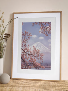 Dieses wunderschöne Poster zeigt die zarten Kirschblüten vor dem majestätischen Hintergrund des Mount Fuji. Die rosa Blütenzweige rahmen den schneebedeckten Gipfel des Berges ein und schaffen eine harmonische Komposition, die die Schönheit der japanischen Natur und Kultur einfängt. Der klare blaue Himmel und die sanften Wolken verstärken die friedliche und erhabene Atmosphäre des Bildes. Ein perfektes Kunstwerk, um jedem Raum eine ruhige und elegante Note zu verleihen.