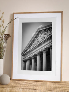 Die Madeleine-Kirche in Paris zeigt klassische französische Architektur mit korinthischen Säulen und Relief-Verzierungen. Ergänzt klassische Einrichtung mit historischem Charakter. Ein eleganter Akzent in Büroräumen oder über dem Sideboard.