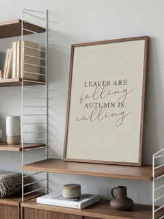 Ein stilvolles Textposter mit dem Zitat „Leaves are falling, autumn is calling“ in einer Kombination aus schwarzen und braunen Schriftarten auf einem beigen Hintergrund. Dieses Poster fängt die Essenz des Herbstes ein und ist eine perfekte Ergänzung für jede herbstliche Dekoration.