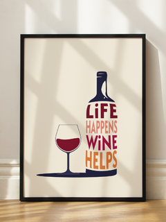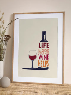 Dieses Poster zeigt eine stilisierte Illustration einer Weinflasche mit dem Text "Life happens wine helps" in kräftigen Farben. Neben der Flasche steht ein Glas Rotwein, das eine entspannte und humorvolle Atmosphäre schafft. Der beige Hintergrund sorgt dafür, dass die Elemente im Vordergrund hervortreten. Perfekt, um deiner Küche oder deinem Esszimmer eine spielerische Note zu verleihen.