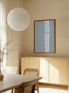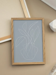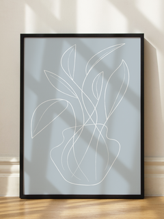Ein minimalistisches Linienkunstposter, das eine stilisierte Pflanze in einer Vase auf einem blauen Hintergrund darstellt. Die feinen weißen Linien schaffen ein elegantes und modernes Design, das sich perfekt in zeitgenössische Wohnräume einfügt. Dieses Kunstwerk bringt einen Hauch von Ruhe und Einfachheit in Ihr Zuhause.