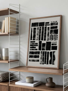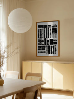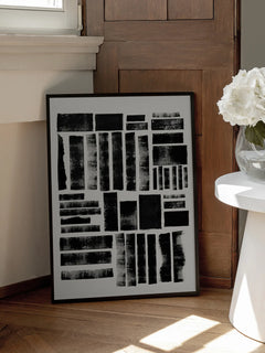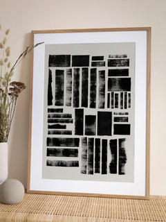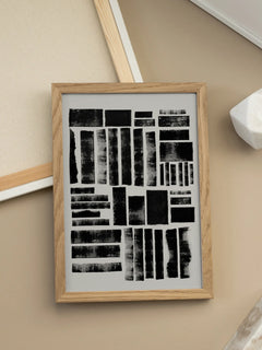 Dieses Poster zeigt eine abstrakte Komposition aus schwarzen Formen auf einem hellgrauen Hintergrund. Inspiriert von der Druckgrafik, vermittelt das Kunstwerk eine raue, handgemachte Qualität. Die unregelmäßigen Formen und Texturen verleihen dem Bild eine dynamische und künstlerische Ausstrahlung, die sowohl modern als auch zeitlos wirkt. Perfekt für Liebhaber von abstrakter Kunst und minimalistischen Designs.