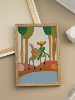 Dieses bezaubernde Poster zeigt ein illustriertes Rehkitz, das einen gelben Hut und einen grünen Schal trägt. Es steht in einem stilisierten Wald mit bunten Bäumen und einem sanften beigen Hintergrund. Die verspielte und farbenfrohe Darstellung verleiht jedem Raum eine fröhliche und kindliche Atmosphäre. Perfekt für Kinderzimmer oder als fröhlicher Akzent in anderen Wohnbereichen.