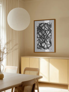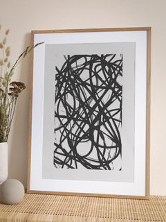 Dieses Schwarz-Weiß-Poster zeigt ein dynamisches Muster aus abstrakten Formen, die durch schwarze Linien auf einem weißen Hintergrund dargestellt werden. Die Komposition wirkt modern und energiegeladen und fügt sich perfekt in eine zeitgenössische Einrichtung ein. Ideal für alle, die ihrem Raum einen Hauch von Abstraktion und Stil verleihen möchten.