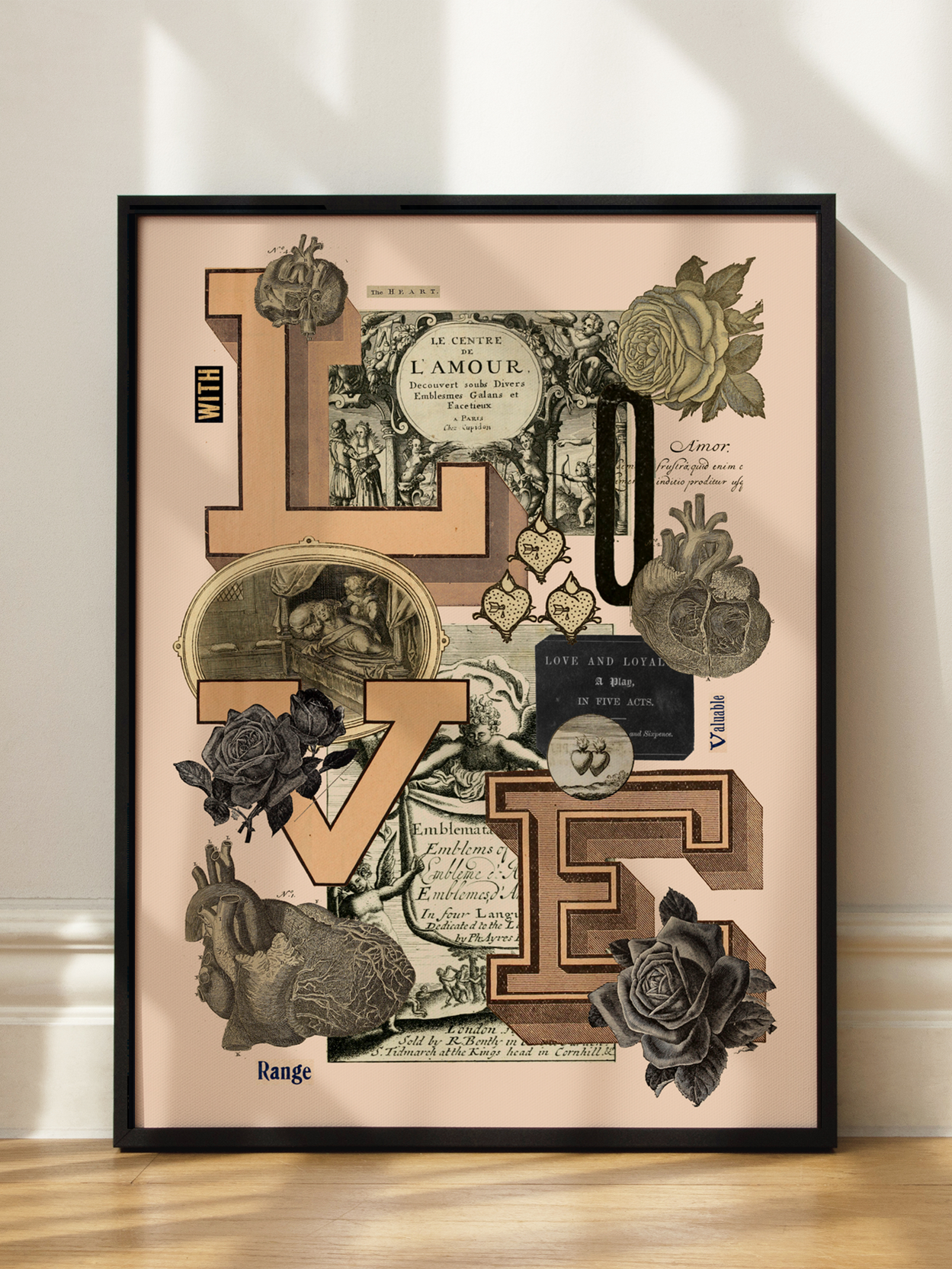 Diese Collage zeigt das Wort "LOVE" in großen Buchstaben, umgeben von Herzen, Rosen und anderen klassischen Illustrationen. Die schwarz-beigen Bilder verleihen dem Kunstwerk einen eleganten und zeitlosen Look, der sich perfekt für ein stilvolles Wohnzimmer oder Schlafzimmer eignet. Die Kombination aus romantischen und klassischen Elementen schafft eine harmonische und ansprechende Ästhetik.
