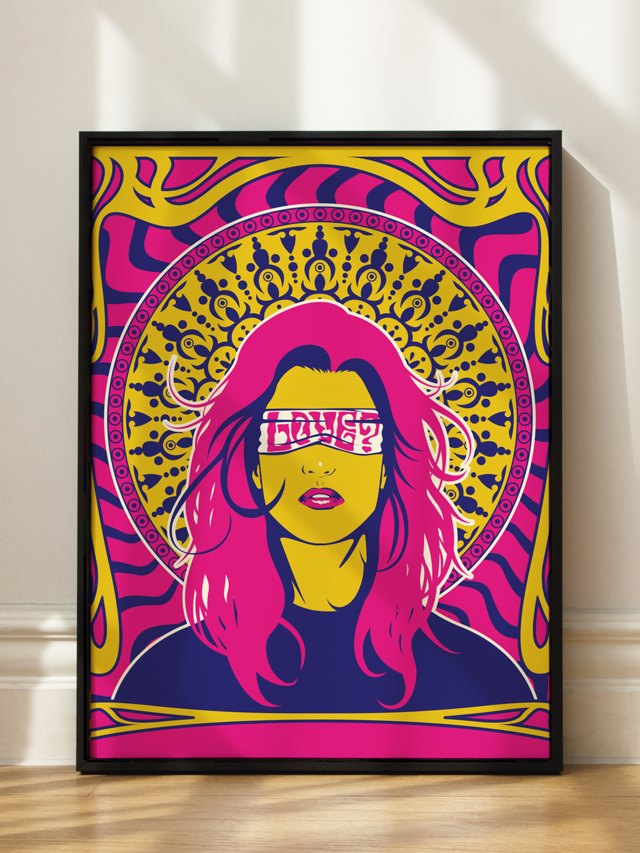 Dieses lebendige Poster zeigt eine Frau mit dem Wort "Love" über ihren Augen. Inspiriert von der Pop-Art, kombiniert das Bild kräftige Farben wie Pink, Gelb und Blau, um einen auffälligen visuellen Effekt zu erzeugen. Der Hintergrund ist mit dekorativen Mustern verziert, die dem Bild Tiefe und Komplexität verleihen. Ein perfektes Kunstwerk, um jedem Raum einen modernen und künstlerischen Touch zu verleihen.