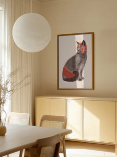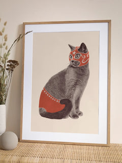 Dieses verspielte Poster zeigt eine Katze, die in einem auffälligen roten Luchador-Kostüm posiert. Die Kombination aus dem niedlichen Tier und dem kraftvollen Wrestling-Motiv schafft einen einzigartigen Blickfang, der perfekt für den Flur oder das Schlafzimmer geeignet ist. Das Poster fügt sich hervorragend in eine Sammlung von Grafik- oder Tierpostern ein und bringt einen Hauch von Humor und Originalität in jeden Raum.
