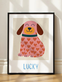 Dieses bezaubernde Poster zeigt einen lächelnden Hund in Rosa, der mit roten Herzen verziert ist. Der Name "Lucky" steht in blauen Buchstaben darunter. Perfekt für Kinderzimmer oder jeden Raum, der einen verspielten und charmanten Akzent benötigt.