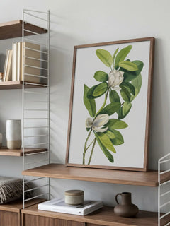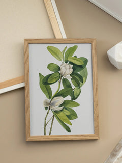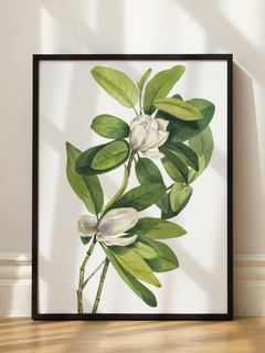 Diese Illustration zeigt eine elegante Magnolienblume mit üppigen grünen Blättern und zarten weißen Blüten. Der Vintage-Stil verleiht dem Bild einen klassischen Charme, der sich ideal für eine Bilderwand im Wohn- oder Schlafzimmer eignet. Die feinen Details und die sanften Farben schaffen eine beruhigende und natürliche Atmosphäre, die jedem Raum eine zeitlose Eleganz verleiht.