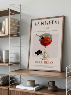 Dieses Poster zeigt eine stilvolle Illustration eines Manhattan-Cocktails auf einem hellrosa Hintergrund. Der Cocktail ist in einem eleganten Glas dargestellt, garniert mit einer Kirsche. Der Text in Schwarz und Rot verleiht dem Bild einen klassischen und zeitlosen Look. Perfekt für die Küche oder die Hausbar, bringt dieses Kunstwerk einen Hauch von Eleganz und Raffinesse in jeden Raum.