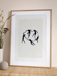 Henri Matisse' berühmte Tänzer-Silhouetten im Kreis zeigen pure Lebensfreude und Bewegung. Die minimalistische Darstellung in Schwarz auf hellem Grund funktioniert in modernen wie klassischen Räumen. Ein zeitloser Kunstklassiker der Moderne.