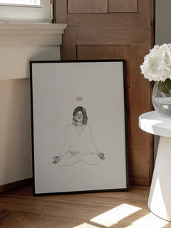 Diese Illustration zeigt eine Frau, die in einer meditativen Haltung sitzt, mit geschlossenen Augen und einem rosa Punkt über ihrem Kopf. Die Darstellung ist in Schwarz-Weiß gehalten und hebt sich vor einem hellbeigen Hintergrund ab. Dieses Kunstwerk strahlt Ruhe und Gelassenheit aus und eignet sich ideal für ein Schlafzimmer, um eine entspannende Atmosphäre zu schaffen.