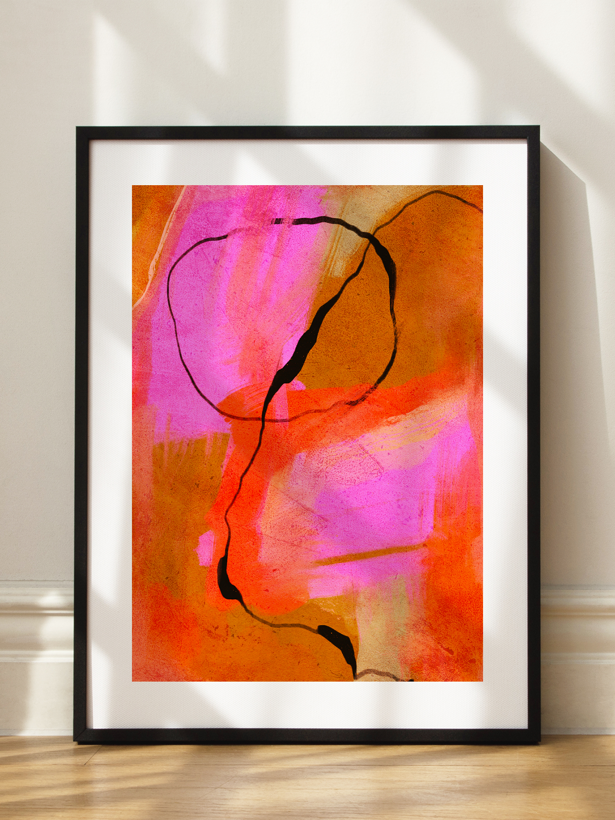 Dieses Poster zeigt ein faszinierendes abstraktes Design mit leuchtend pinken und orangefarbenen Tönen. Die Darstellung eines Kopfes in einer dynamischen und künstlerischen Weise zieht die Aufmerksamkeit auf sich und verleiht jedem Raum eine lebendige und moderne Atmosphäre. Perfekt als Blickfang in deiner Bilderwand.