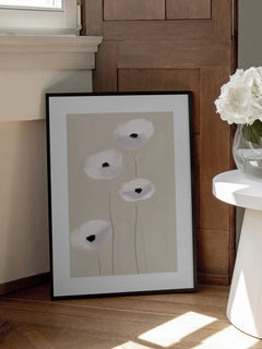Dieses Poster zeigt eine elegante grafische Illustration von vier weißen Blumen mit schwarzen Mitten und dünnen Stängeln vor einem beigen Hintergrund. Die sanften Farben und das minimalistische Design machen es zu einer idealen Ergänzung für ein Schlafzimmer, wo es eine ruhige und entspannende Atmosphäre schafft.
