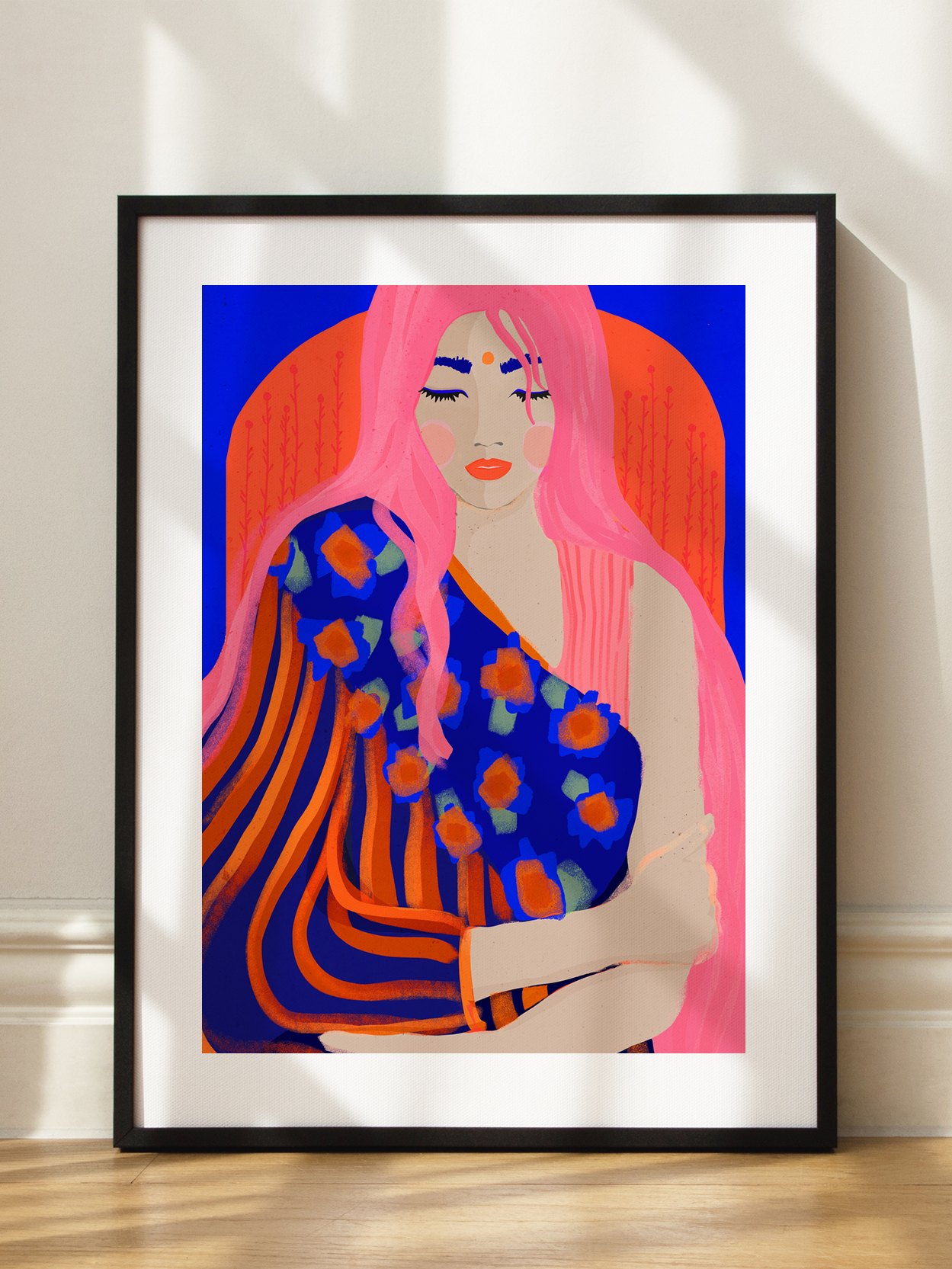 Dieses Poster zeigt ein faszinierendes Porträt einer Frau mit auffälligen rosa Haaren. Sie trägt eine blaue Bluse, die mit Blumen und Streifen verziert ist. Der Hintergrund ist in lebendigen Blau- und Orangetönen gehalten, was dem Bild eine dynamische und moderne Ausstrahlung verleiht. Entworfen von der Künstlerin Malavida, fängt dieses Kunstwerk die Essenz von Farbe und Stil ein und ist ein perfekter Blickfang für jede moderne Einrichtung.