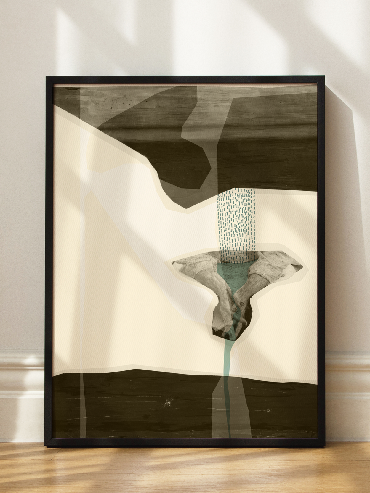 Dieses abstrakte Poster zeigt eine Collage aus verschiedenen Formen in Beige, Braun und Türkis. Die Komposition kombiniert geometrische Elemente mit organischen Formen und schafft ein modernes und einzigartiges Kunstwerk. Die harmonische Farbpalette verleiht dem Bild eine ruhige und dennoch dynamische Ausstrahlung, die perfekt in ein trendiges Zuhause passt.