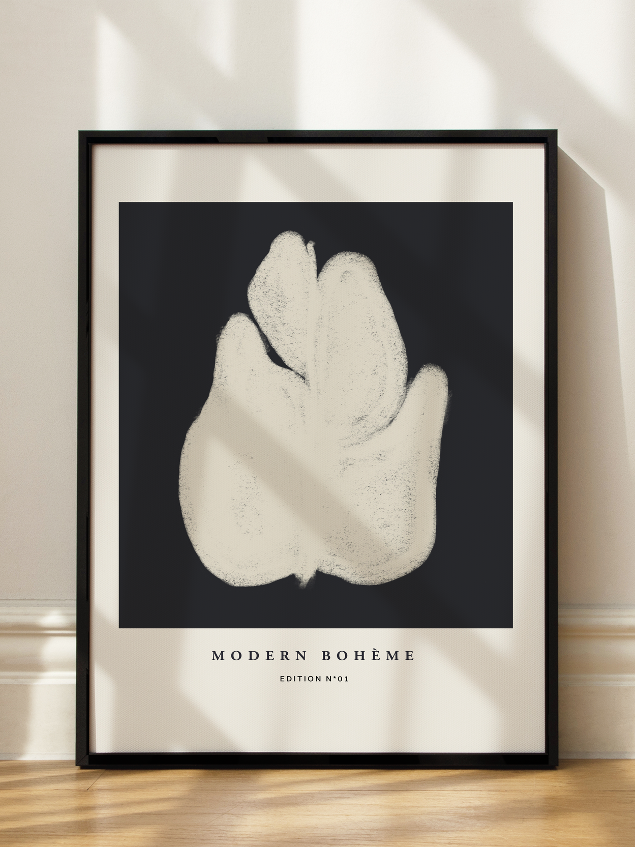 Dieses Poster zeigt eine stilisierte weiße Blume auf einem dunkelgrauen Hintergrund. Unter der Blume steht der Text "Modern Bohème Edition No1". Das Design kombiniert schlichte Eleganz mit einem modernen Touch und ist ideal für ein zeitgemäßes Wohnambiente.