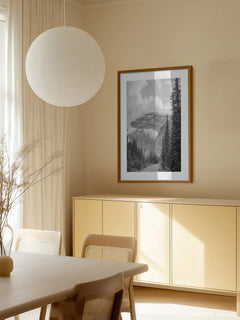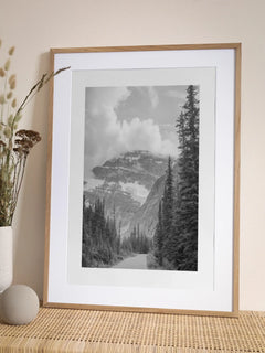 Diese beeindruckende Schwarz-Weiß-Fotografie zeigt eine kurvige Straße, die durch einen dichten Wald führt, mit einem majestätischen Berg im Hintergrund. Die Wolken umhüllen den Berggipfel und verleihen dem Bild eine geheimnisvolle und erhabene Atmosphäre. Dieses Poster inspiriert zu neuen Abenteuern und Reisen und ist perfekt für alle, die die Schönheit der Natur schätzen.