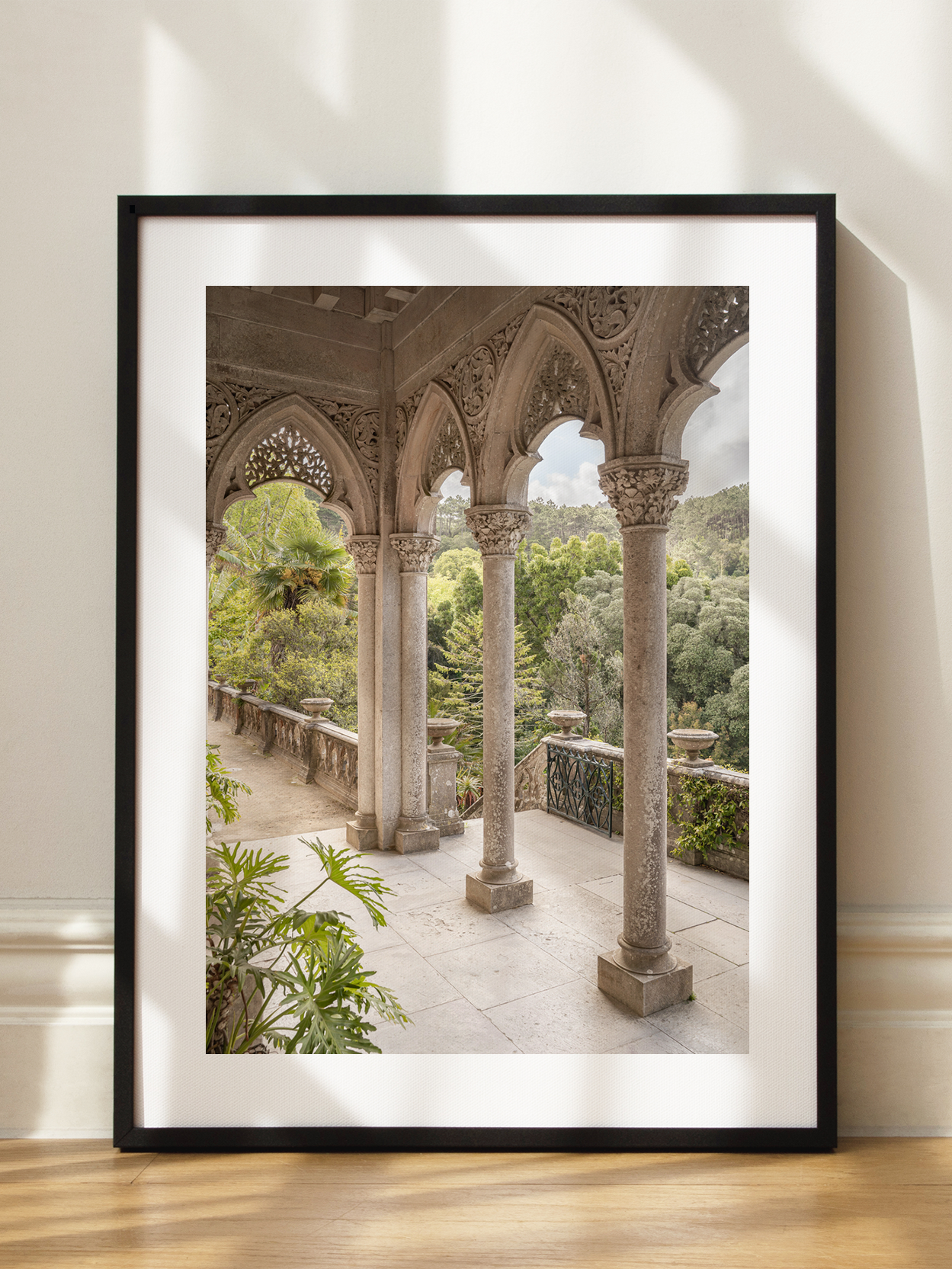 Diese Fotografie zeigt einen eleganten Balkon mit kunstvoll verzierten Bögen, der einen Blick auf einen üppigen, grünen Garten bietet. Die Architektur des Monserrate-Palastes wird durch die detaillierten Steinmetzarbeiten und die harmonische Verbindung zur umgebenden Natur hervorgehoben. Dieses Poster ist ideal für Liebhaber von Architektur und Natur und bringt eine ruhige, historische Atmosphäre in jeden Raum.