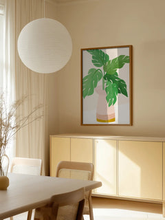 Dieses Poster zeigt eine stilvolle Illustration einer Monstera-Pflanze in kräftigem Grün, die in einer eleganten rosa Vase arrangiert ist. Der hellbeige Hintergrund sorgt für einen sanften Kontrast und hebt die Pflanze hervor. Perfekt, um einen modernen und frischen Akzent in deinem Zuhause zu setzen.