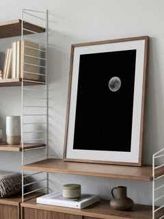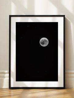Dieses beeindruckende Schwarzweißfoto zeigt den Mond und die Sterne in einer klaren Nacht. Der Mond ist detailliert und kontrastiert stark mit dem tiefschwarzen Hintergrund des Himmels. Die subtilen Sterne umgeben den Mond und schaffen eine ruhige, fast meditative Atmosphäre. Dieses Poster ist ideal für Astronomie-Enthusiasten und verleiht jedem Raum eine geheimnisvolle und beruhigende Note.