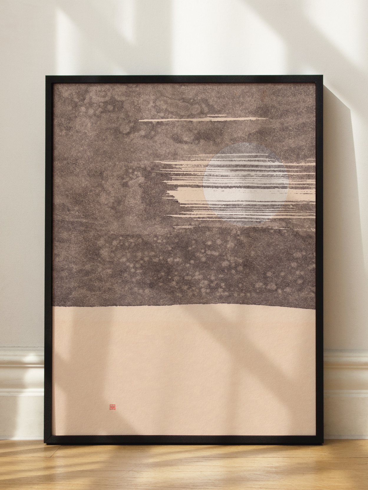 Dieses Poster zeigt eine künstlerische Darstellung des Mondes in einer nächtlichen Szene. Der Mond leuchtet in einem dunklen Himmel, der über einer beigen Landschaft liegt. Die Illustration hat einen Vintage-Look, der durch die gedämpften Farben und die strukturierte Darstellung verstärkt wird. Diese Komposition vermittelt ein Gefühl von Ruhe und zeitloser Schönheit und eignet sich perfekt, um jedem Raum eine elegante und beruhigende Atmosphäre zu verleihen.