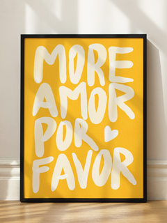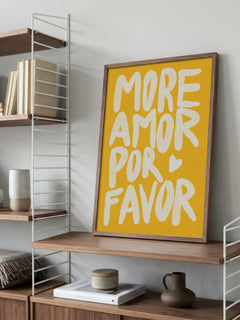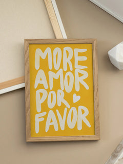 Fröhliche Liebesbotschaft in warmen Gelbtönen. Das spanische "More Amor Por Favor" strahlt positive Energie aus und funktioniert als Blickfang im Schlafzimmer oder Wohnbereich.