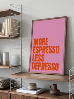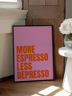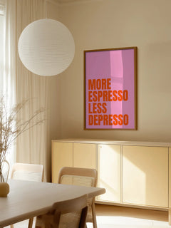 Wenn du eine gemütliche Sitzecke hast, in der du gerne deine Tasse Kaffee genießt, dann ist das „More Espresso, Less Depresso“ Poster eine perfekte Ergänzung.