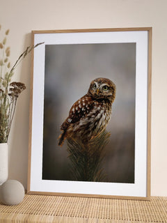Dieses Poster zeigt eine bezaubernde Eule mit einem braun-weißen Gefieder, die auf einem Ast sitzt. Der Hintergrund ist unscharf und in Grau- und Beigetönen gehalten, was den Fokus auf die Eule lenkt. Die Eule wirkt aufmerksam und lebendig, was dem Bild eine faszinierende und natürliche Ausstrahlung verleiht. Perfekt für Naturliebhaber und als dekoratives Element in jedem Raum.