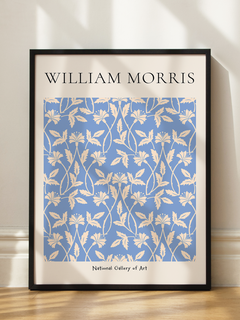 Dieses Poster zeigt eine grafische Illustration von beigen Blumen auf einem hellblauen Hintergrund, eingerahmt von Text auf einem beigen Hintergrund. Inspiriert von den klassischen Designs von William Morris, bringt dieses Kunstwerk ein frisches und elegantes Gefühl in dein Zuhause. Perfekt für Liebhaber von traditionellem Design und floralen Mustern.