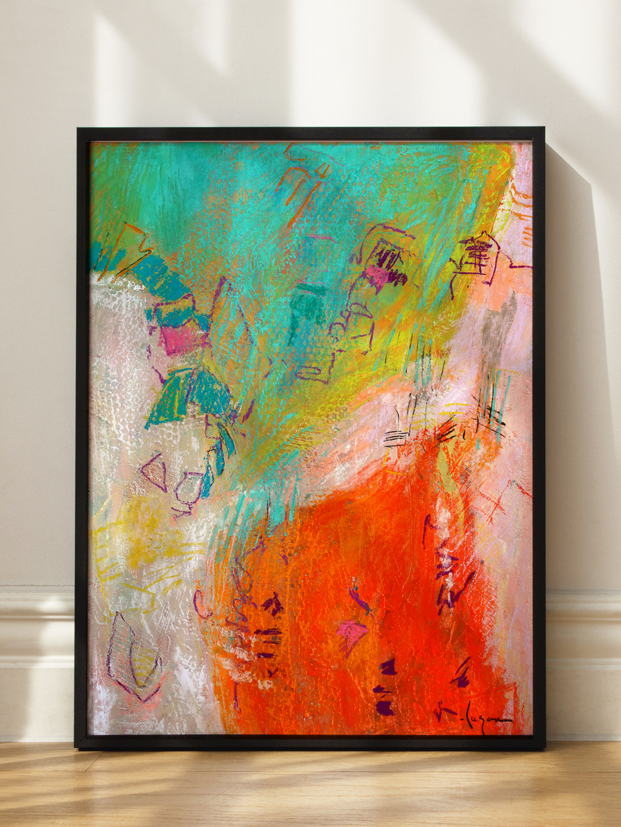 Dieses lebhafte abstrakte Poster zeigt eine dynamische Komposition aus verschiedenen Formen und Symbolen wie Dreiecken, Quadraten und Kreisen. Die leuchtenden Farben Rot, Türkis und Gelb verleihen dem Bild eine energetische Ausstrahlung. Durch den Einsatz unterschiedlicher Techniken und Texturen entsteht eine beeindruckende Tiefe und Dimension, die das Kunstwerk besonders faszinierend macht.