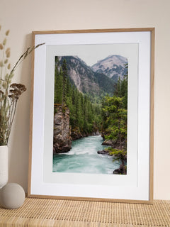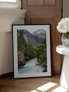 Diese beeindruckende Fotografie zeigt einen Fluss, der sich durch einen dichten Wald schlängelt, mit einem majestätischen Berg im Hintergrund. Die Szenerie fängt die unberührte Schönheit der Natur ein und vermittelt ein Gefühl von Ruhe und Erhabenheit. Die grünen Bäume und das klare Wasser schaffen eine harmonische und friedliche Atmosphäre, die perfekt für Naturliebhaber ist.