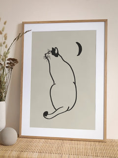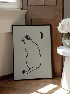 Eine sitzende Katze im minimalistischen Line-Art-Stil mit geschwungenem Schwanz und Halbmond. Funktioniert besonders gut in modernen Räumen mit hellen Wandfarben. Die reduzierte Schwarz-Weiß-Darstellung setzt einen eleganten Akzent.