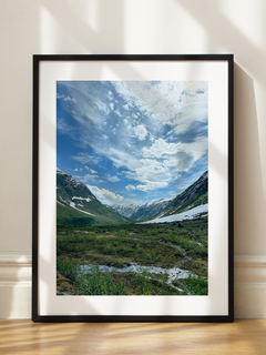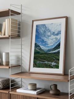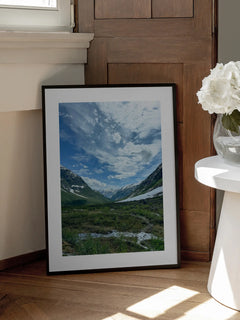 Dieses beeindruckende Poster zeigt eine atemberaubende norwegische Landschaft mit majestätischen grünen Bergen und einem klaren blauen Himmel. Die schneebedeckten Gipfel und das üppige Grün der Vegetation schaffen eine harmonische und beruhigende Szenerie, die perfekt für Naturliebhaber ist. Diese Darstellung der unberührten Natur Norwegens bringt die Schönheit und Ruhe der skandinavischen Landschaft in Ihr Zuhause.