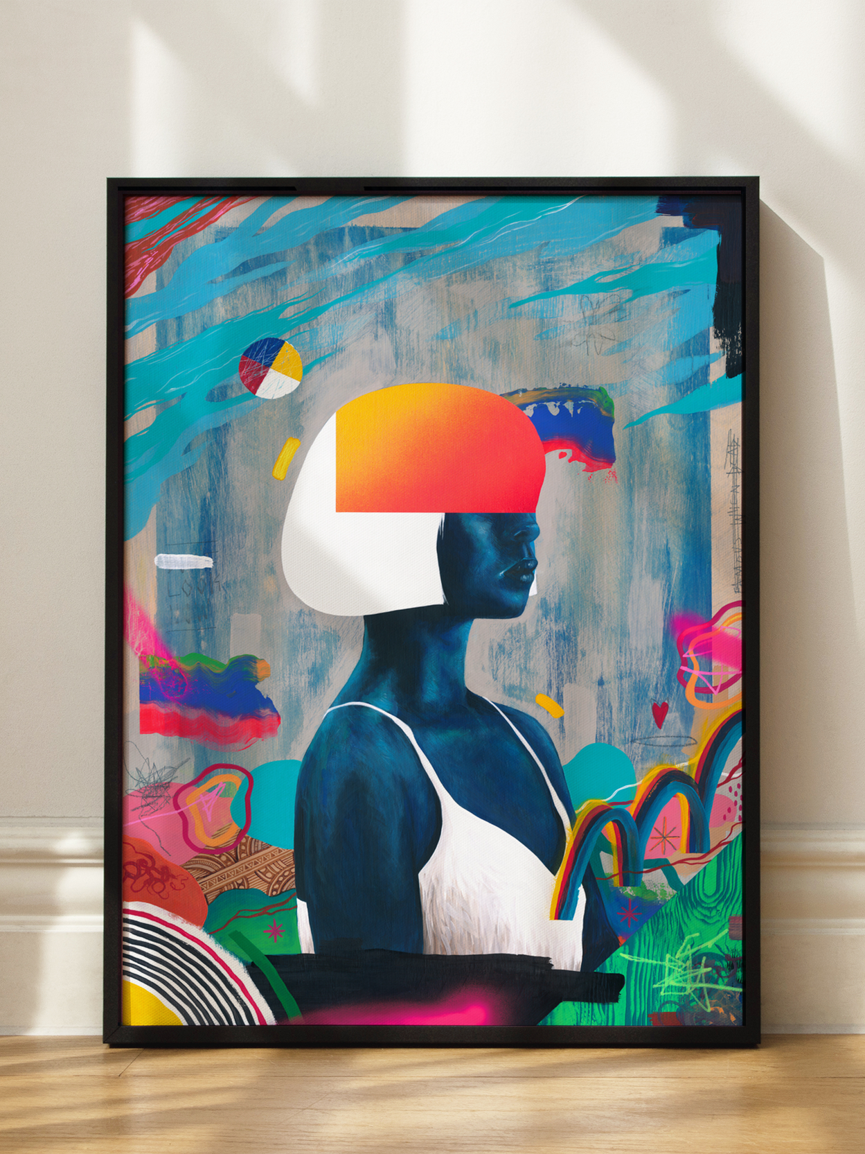 Ein lebhaftes Poster, das eine Frau in einem weißen Kleid zeigt, umgeben von einer Vielzahl von Farben und abstrakten Formen. Der Hintergrund ist in Blau und Grau gehalten, mit farbenfrohen Akzenten in Rot, Rosa, Grün und Gelb. Das Haar der Frau ist in einem auffälligen Farbverlauf von Orange zu Pink gefärbt und bildet einen starken Kontrast zu ihrem dunkelblauen Teint. Ein faszinierendes Stück, das jedem Raum eine dynamische und künstlerische Atmosphäre verleiht.