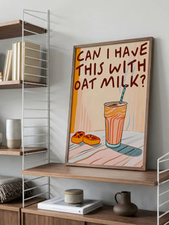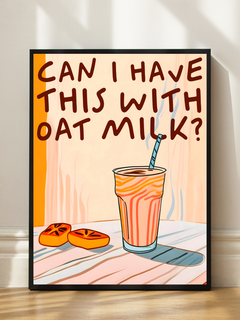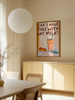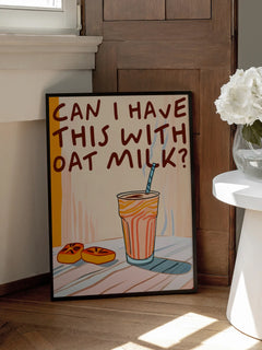 Dieses humorvolle Poster zeigt ein orangefarbenes Getränk mit einem Strohhalm und den Text "Can I have this with oat milk?" in brauner Schrift. Die verspielte Gestaltung und die warmen Farben machen es zu einer perfekten Ergänzung für jede Küche. Es bringt eine humorvolle Note in den Alltag und spricht besonders Liebhaber von Hafermilch an.