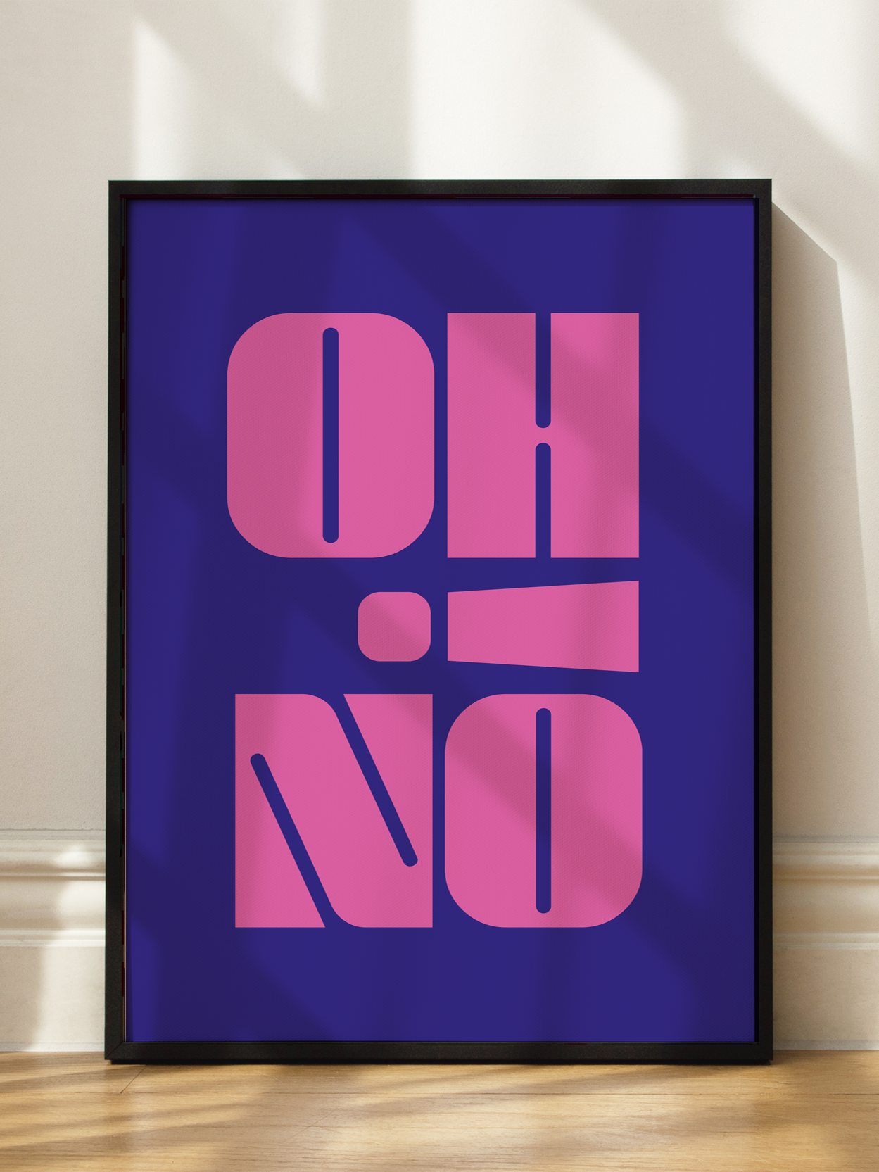 Dieses Poster zeigt den Ausdruck "Oh no" in großen, rosa Buchstaben auf einem tiefblauen Hintergrund. Die kräftigen Farben und der minimalistische Stil machen es zu einem auffälligen und modernen Kunstwerk, das jedem Raum eine lebendige Note verleiht. Perfekt für diejenigen, die ein Statement setzen möchten.