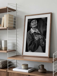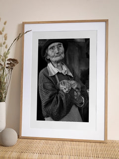 Ein ausdrucksstarkes Schwarzweißfoto, das eine ältere Frau zeigt, die liebevoll eine Katze in ihren Armen hält. Die Details des Gesichts der Frau und die entspannte Haltung der Katze schaffen eine emotionale und intime Atmosphäre. Dieses Bild ist ideal für Liebhaber von Tierfotografie und klassischen Porträts und bringt Wärme und Tiefe in jeden Raum.