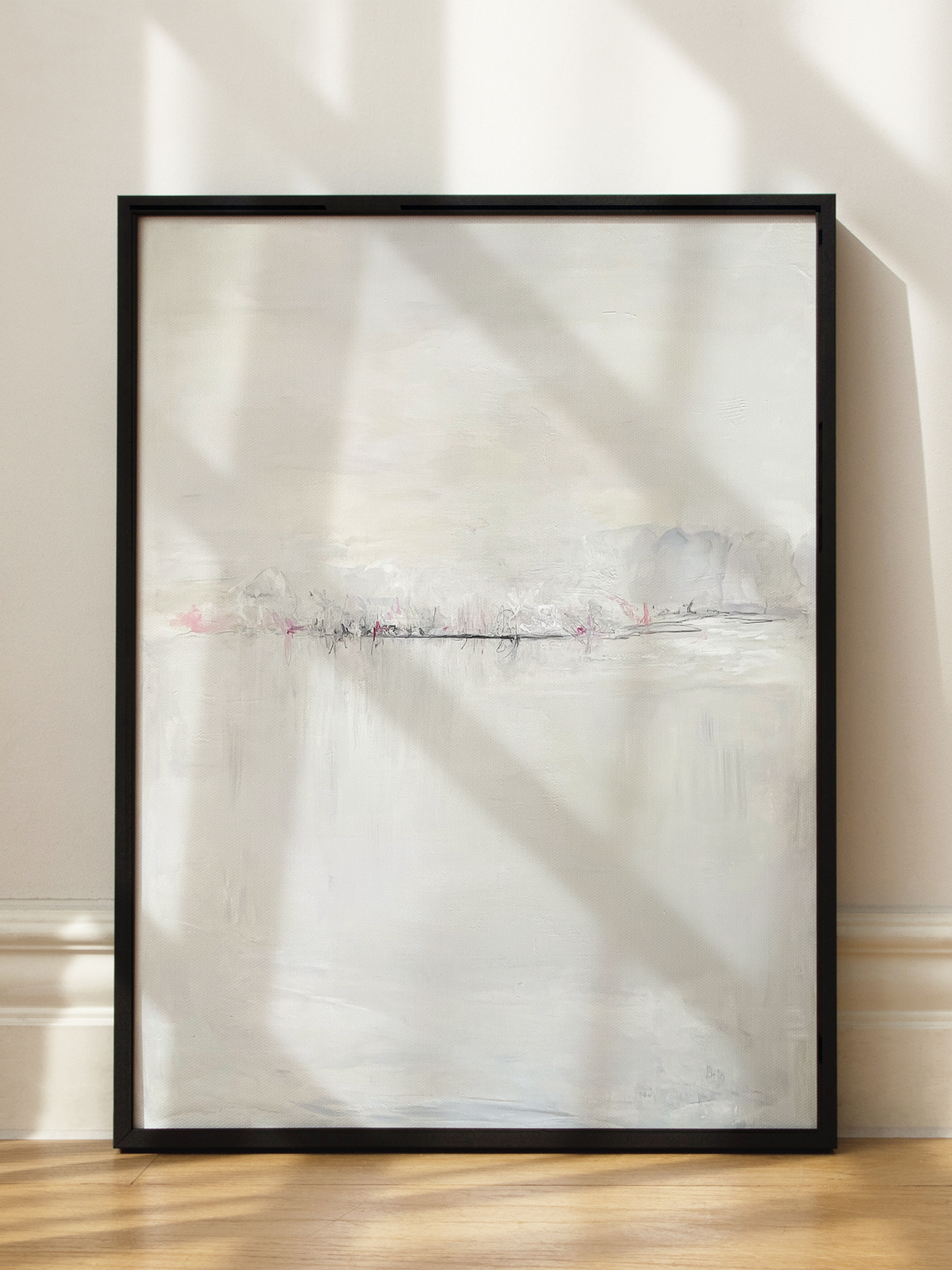 Dieses Bild zeigt eine friedliche Winterlandschaft mit einem ruhigen See und Bäumen in der Ferne. Die sanften und hellen Farben der Malerei schaffen eine beruhigende Atmosphäre, die ideal ist, um deinem Zuhause einen Hauch von Ruhe zu verleihen. Perfekt für Liebhaber von Natur und Winterlandschaften.