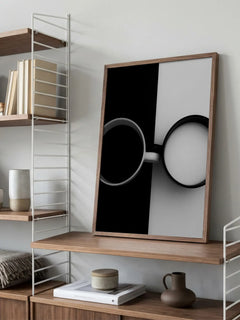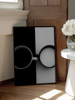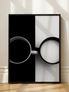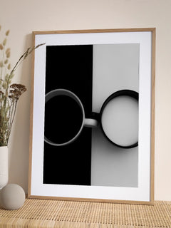 Dieses Schwarz-Weiß-Poster zeigt zwei Tassen aus der Vogelperspektive. Eine Tasse ist mit Kaffee gefüllt und befindet sich auf einem schwarzen Hintergrund, während die andere Tasse mit Milch auf einem weißen Hintergrund steht. Das minimalistische Design spielt mit Kontrasten und Symmetrie und fügt sich perfekt in eine moderne Einrichtung ein. Ein kreatives und stilvolles Kunstwerk, das sowohl in der Küche als auch im Wohnzimmer einen besonderen Akzent setzt.
