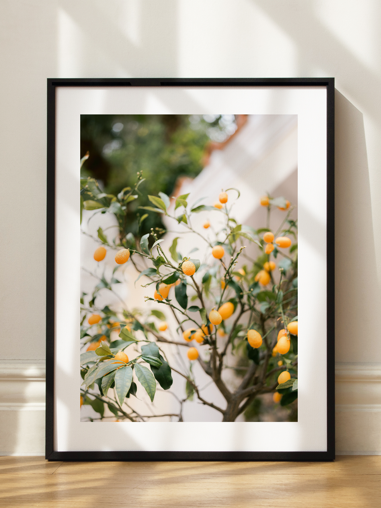 Diese Fotografie zeigt einen Kumquatbaum mit lebendigen grünen Blättern und kleinen, leuchtend orangefarbenen Früchten. Die Komposition bringt einen frischen und natürlichen Look in dein Zuhause und eignet sich perfekt, um jedem Raum eine lebendige Note zu verleihen. Die Details der Blätter und Früchte sind klar und scharf, was die Schönheit der Natur in den Vordergrund stellt.