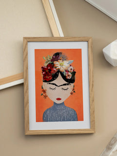 Diese Illustration zeigt eine Frau mit schwarzem Haar und roten Lippen, die einen blauen Pullover trägt. Ihr Haar ist mit bunten Blumen geschmückt, und sie steht vor einem lebhaften orangefarbenen Hintergrund. Die kräftigen Farben und das stilisierte Design bringen Energie und künstlerischen Ausdruck in jeden Raum.