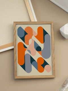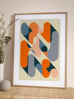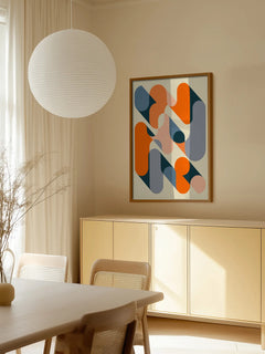 Dieses grafische Poster zeigt eine Komposition aus orangefarbenen und grauen Formen, die mit Schatten auf einem beigen Hintergrund angeordnet sind. Die geometrischen Elemente schaffen ein modernes und dynamisches Design, das sich perfekt für die Dekoration von Fluren oder Wohnzimmern eignet. Die kräftigen Farben und klaren Linien verleihen jedem Raum eine zeitgemäße und stilvolle Note.
