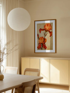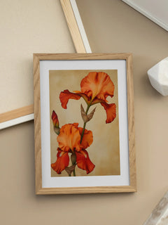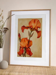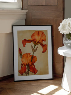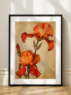 Dieses Poster zeigt zwei Irisblumen in einem lebendigen Orange, die vor einem hellbraunen Hintergrund erstrahlen. Die Blumen sind in voller Blüte und präsentieren ihre detaillierten Blütenblätter und grünen Stängel. Ein wunderschönes Kunstwerk, das jedem Raum eine frische und natürliche Note verleiht.