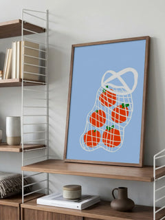 Dieses Poster zeigt eine lebendige Illustration von Tomaten, die in einem weißen Netzbeutel vor einem hellblauen Hintergrund liegen. Die kräftigen Rot- und Blautöne schaffen einen frischen und modernen Look, der perfekt ist, um jeder Küche oder jedem Raum einen Hauch von Farbe zu verleihen. Ideal für Liebhaber von minimalistischen und dennoch ausdrucksstarken Designs.
